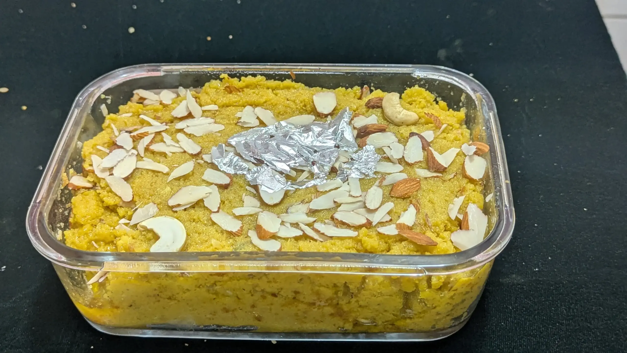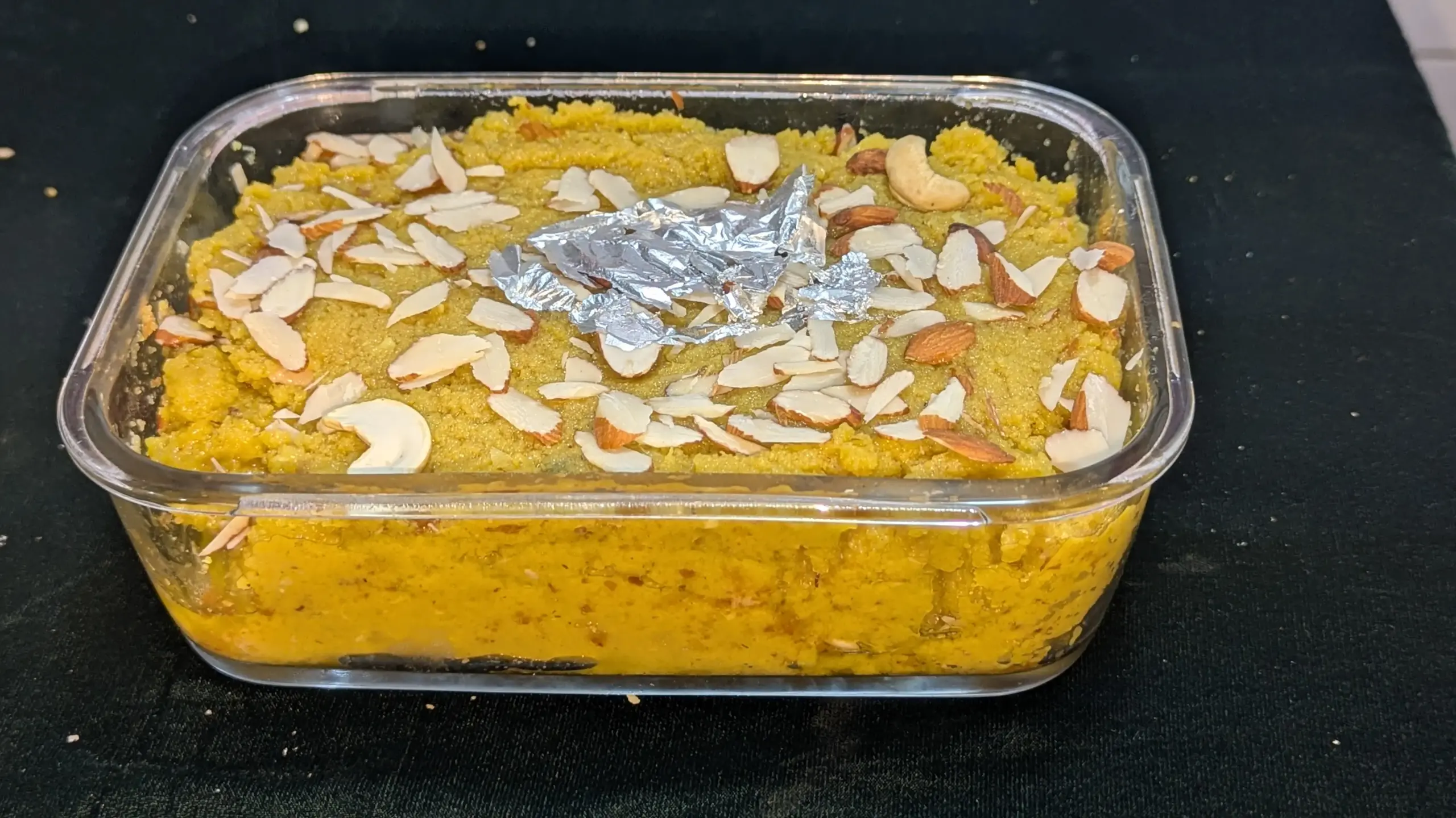 A luxurious, golden winter delicacy from Amin Chugtai Sweets, crafted from ground premium almonds and pure desi ghee, elegantly crowned with silver leaf and crunchy nuts.