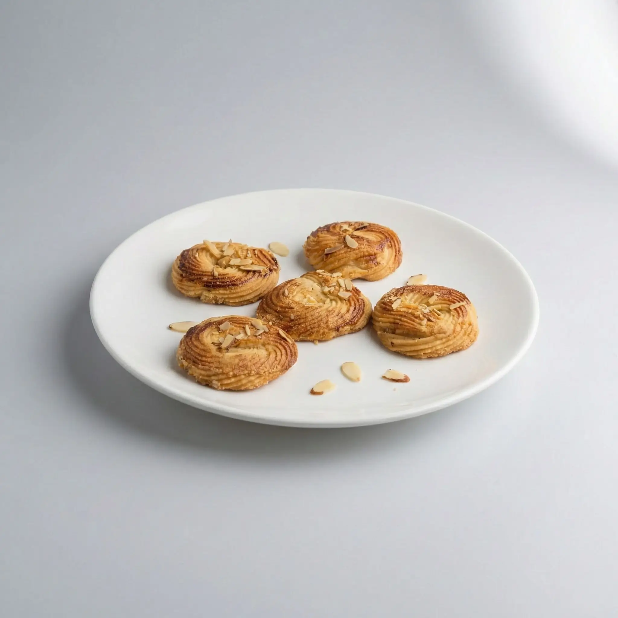 Crispy, golden-brown swirled biscuits from Amin Chugtai Sweets. Expertly piped for a delightful crunch and elegantly topped with fresh almond flakes
